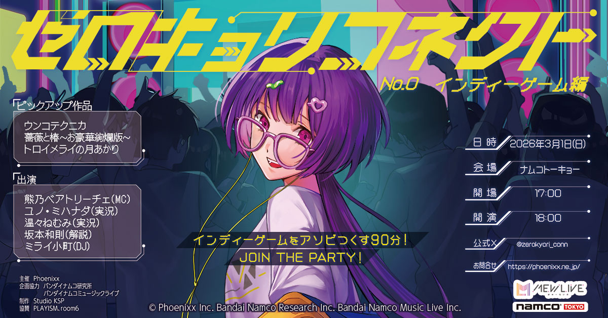 - 『ゼロキョリコネクト No.0 ~インディーゲーム編~』2026年3月1日(日) namco TOKYOにて開催決定! ~インディーゲームとVTuberを“ゼロキョリ”で楽しむ、新感覚イベント~